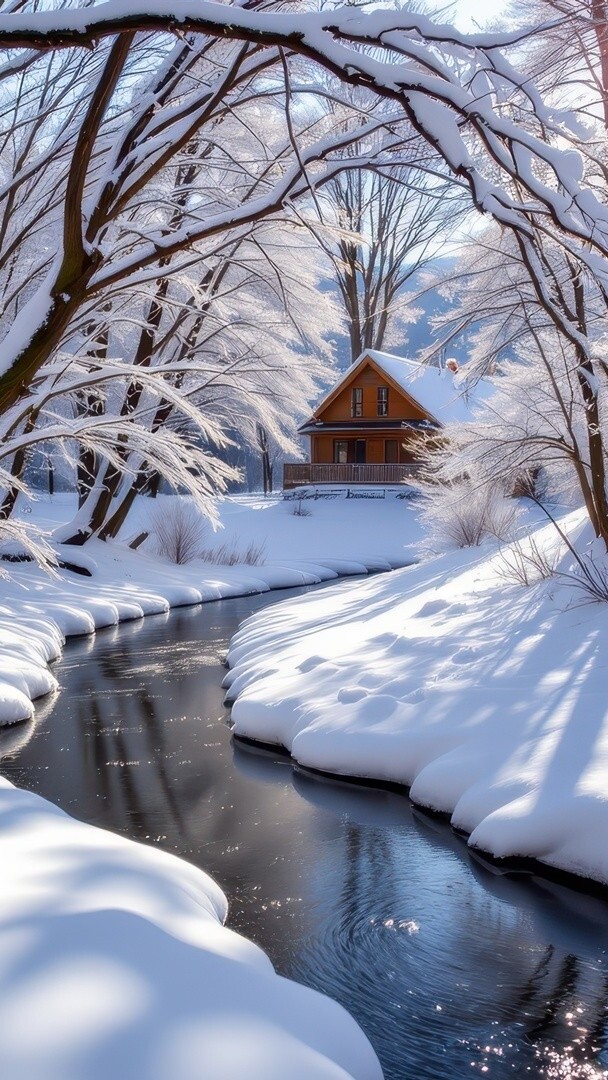 Edytor tapety: Ośnieżone drzewa i dom nad rzeką