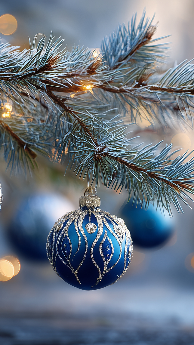 Edytor tapety: Niebieskie bombki na sosnowej gałązce