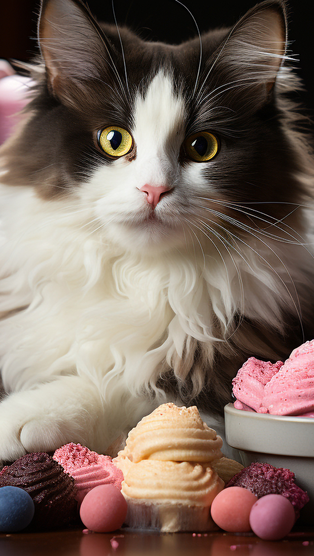 Edytor tapety: Czarno-biały kot leżący obok babeczek