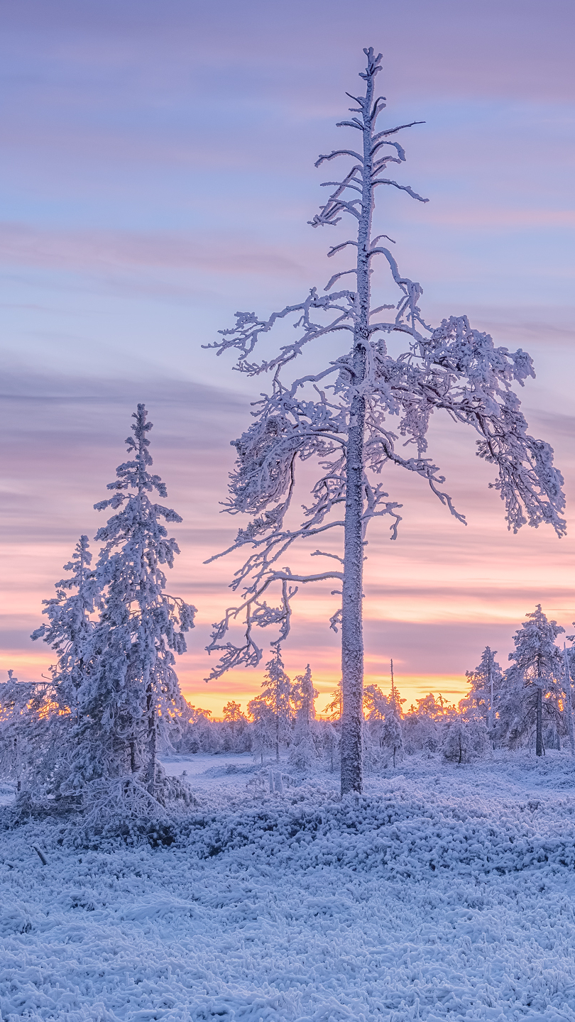 Edytor tapety: Ośnieżone drzewa o zachodzie słońca