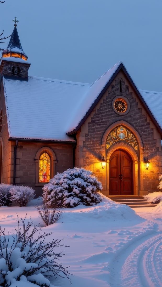 Edytor tapety: Oświetlony kościół w zimowej scenerii