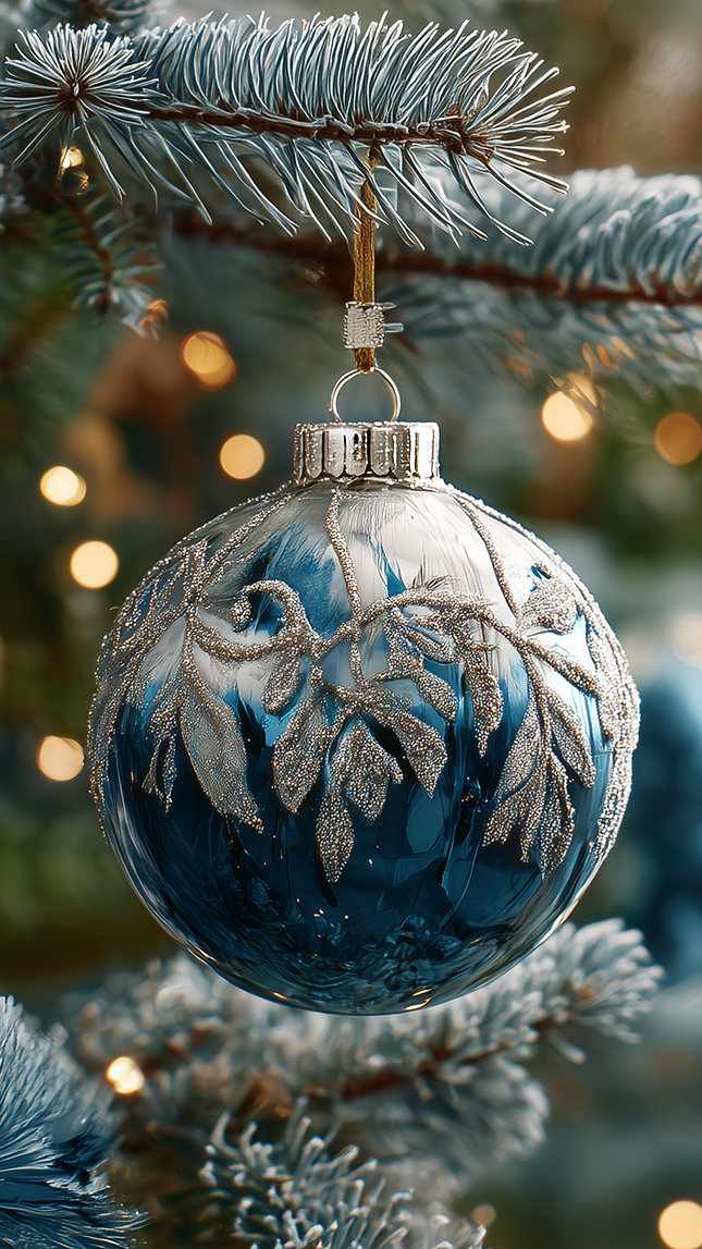 Edytor tapety: Niebieska dekoracyjna bombka na gałązce świerkowej