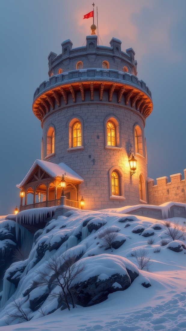 Edytor tapety: Oświetlona wieża na ośnieżonej skale