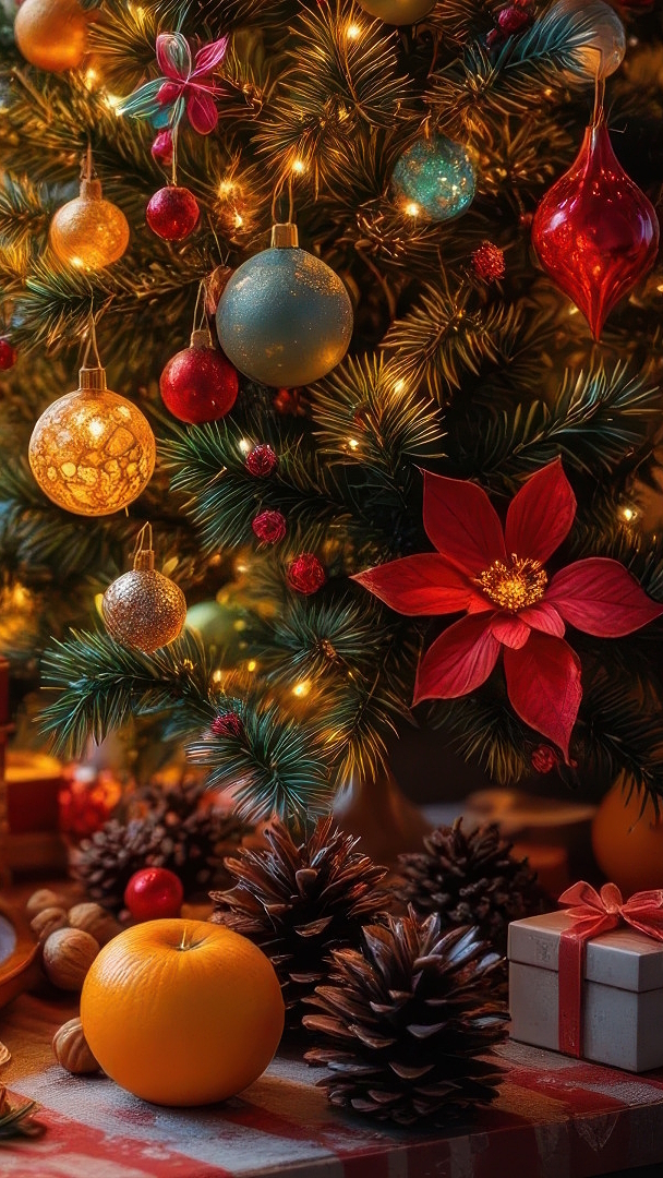 Edytor tapety: Prezenty i szyszki pod udekorowaną choinką