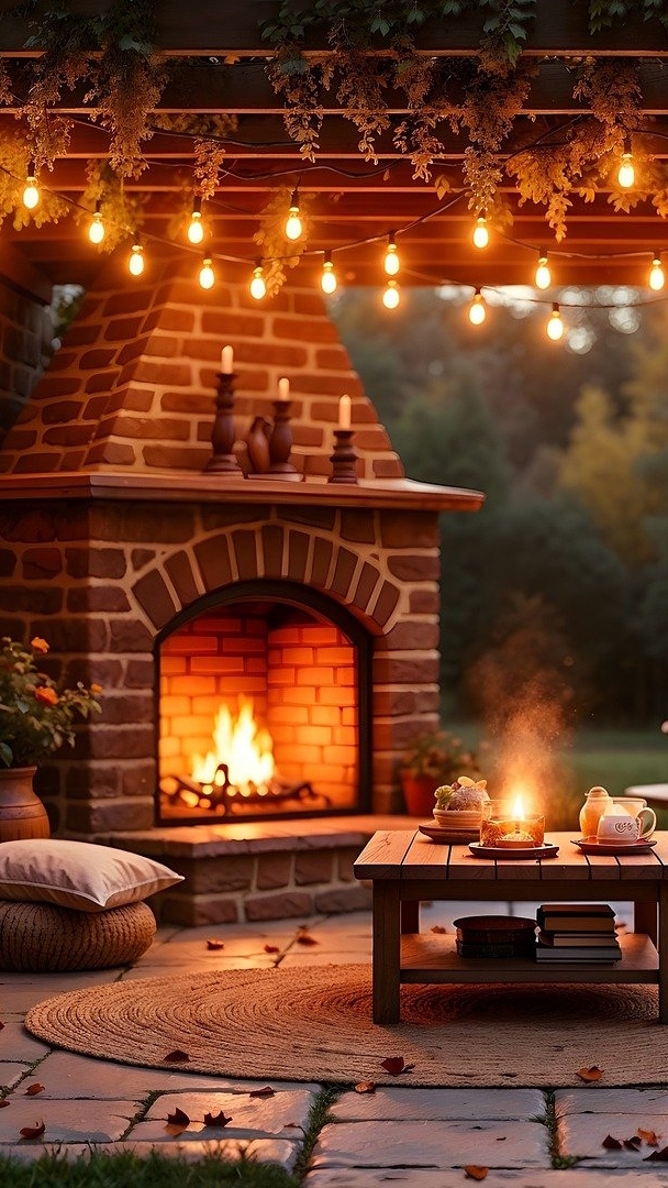 Edytor tapety: Kominek i zapalone lampki na tarasie