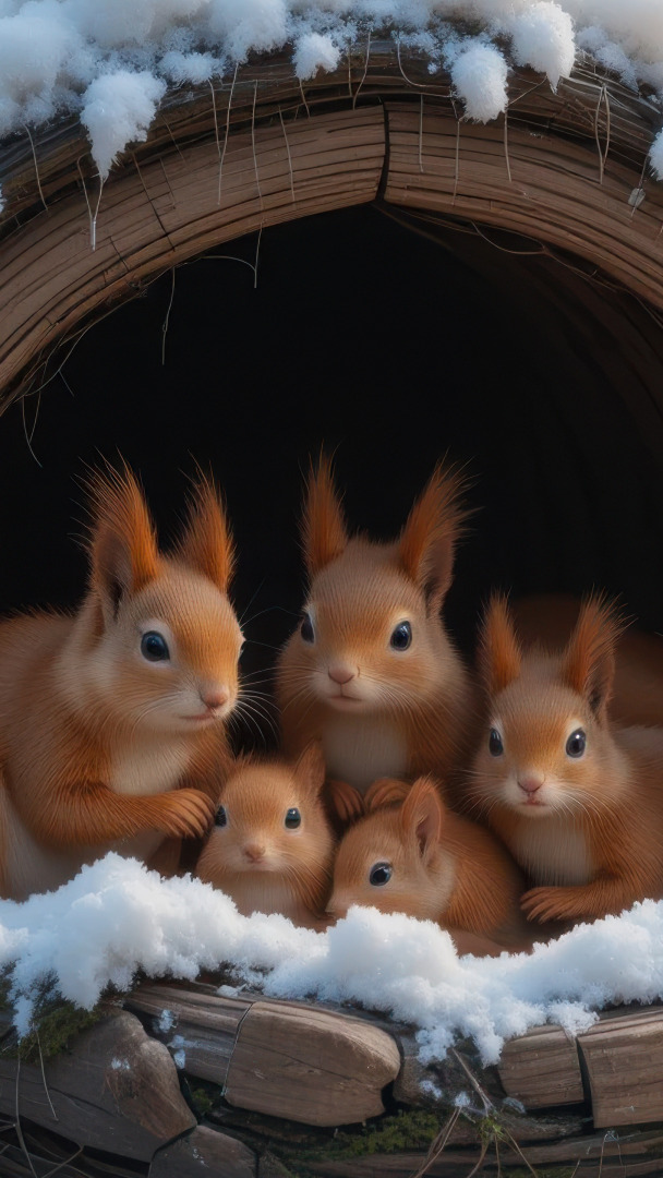 Edytor tapety: Wiewiórki w ośnieżonej dziupli
