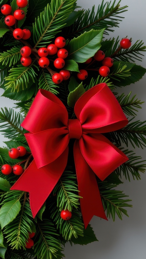 Edytor tapety: Czerwona kokarda i jagody na wieńcu