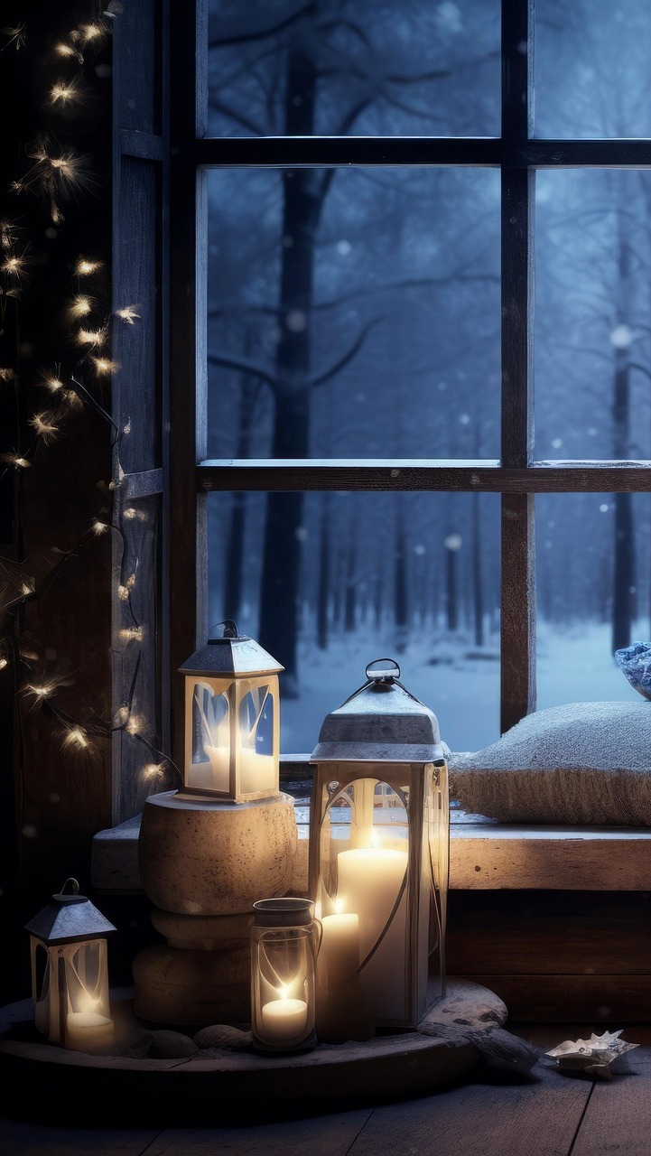Edytor tapety: Zapalone nocą lampiony przy oknie