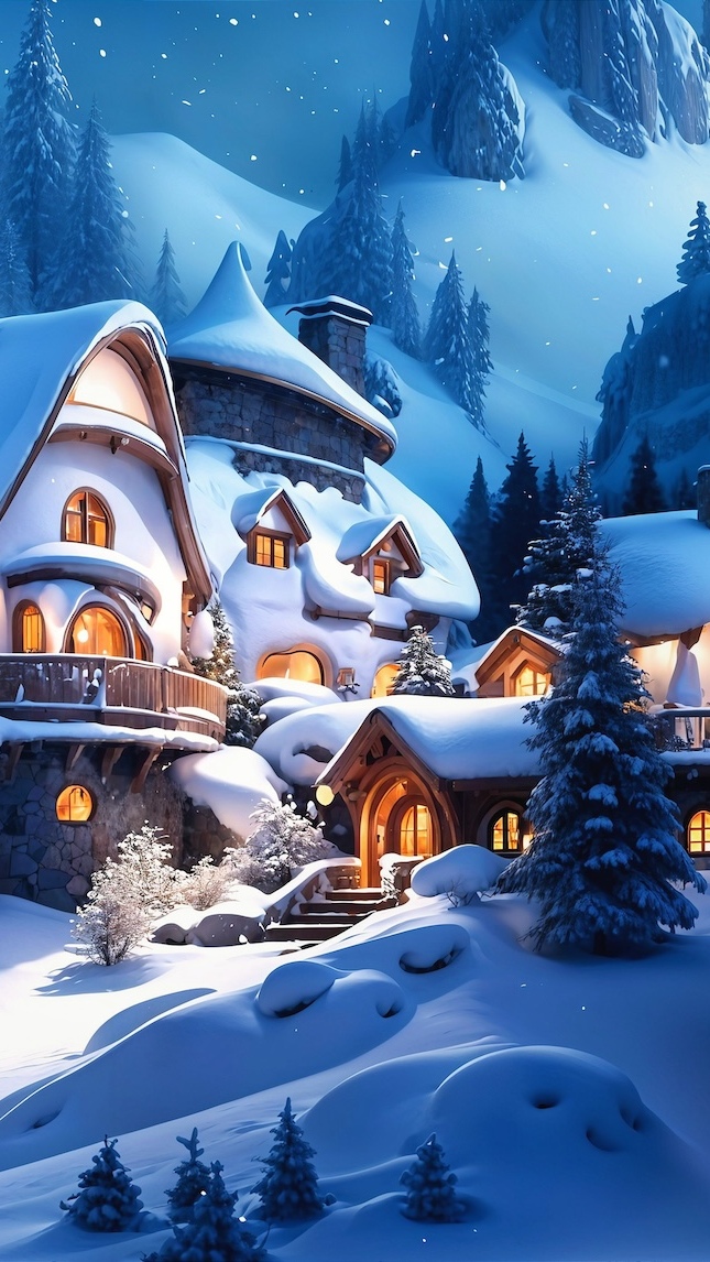 Edytor tapety: Oświetlone domy w górach zimową porą