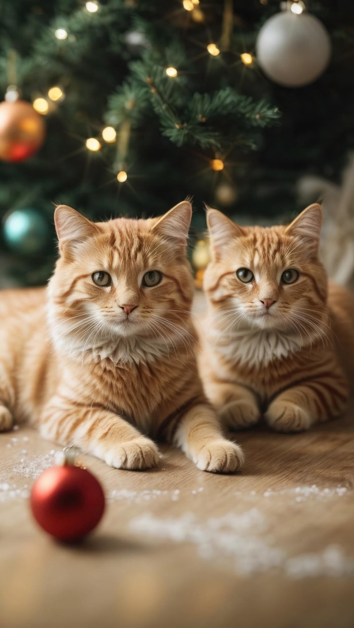 Edytor tapety: Dwa rude koty leżące obok choinki