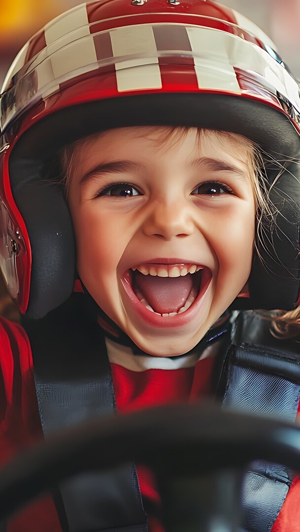 Edytor tapety: Radosne dziecko w kasku za kierownicą