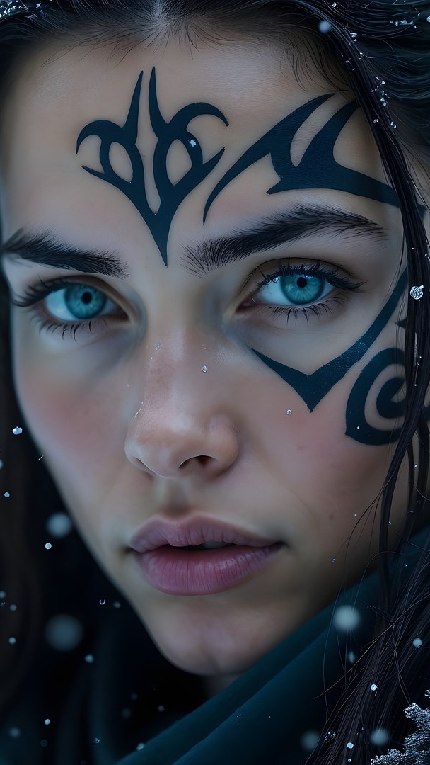 Edytor tapety: Niebieskooka brunetka z tatuażem na twarzy