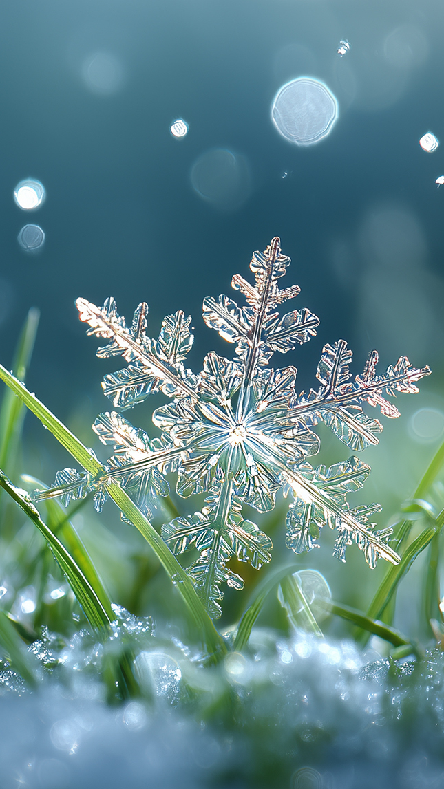 Edytor tapety: Rozświetlona śnieżynka na śniegu w trawie
