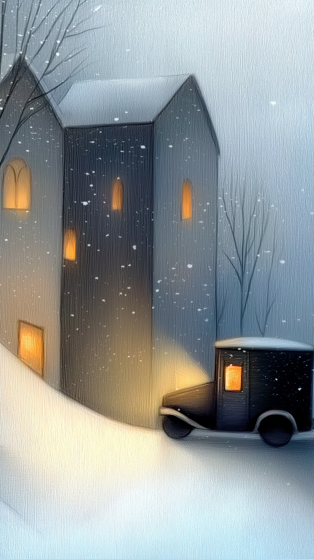 Edytor tapety: Samochód przed oświetlonymi domami zimową porą