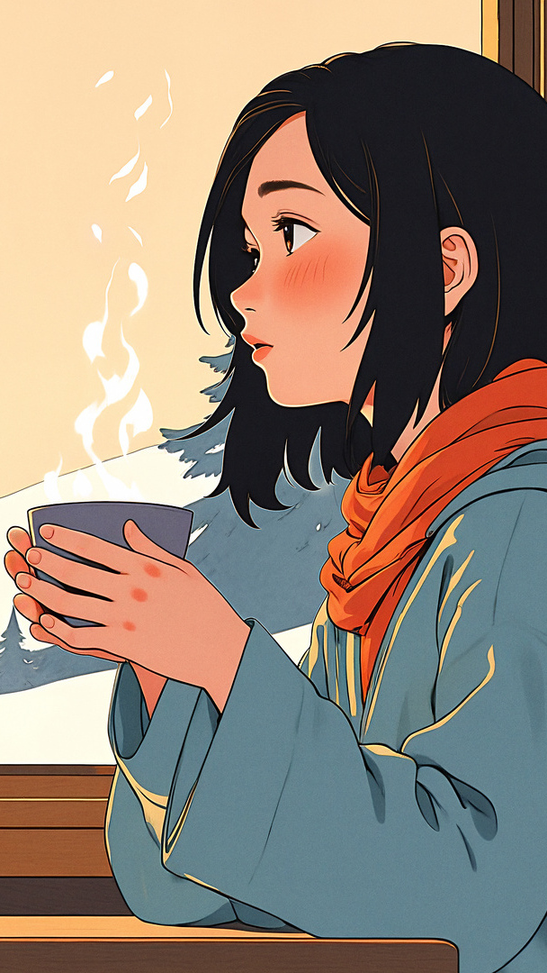 Edytor tapety: Dziewczyna z kubkiem przy oknie