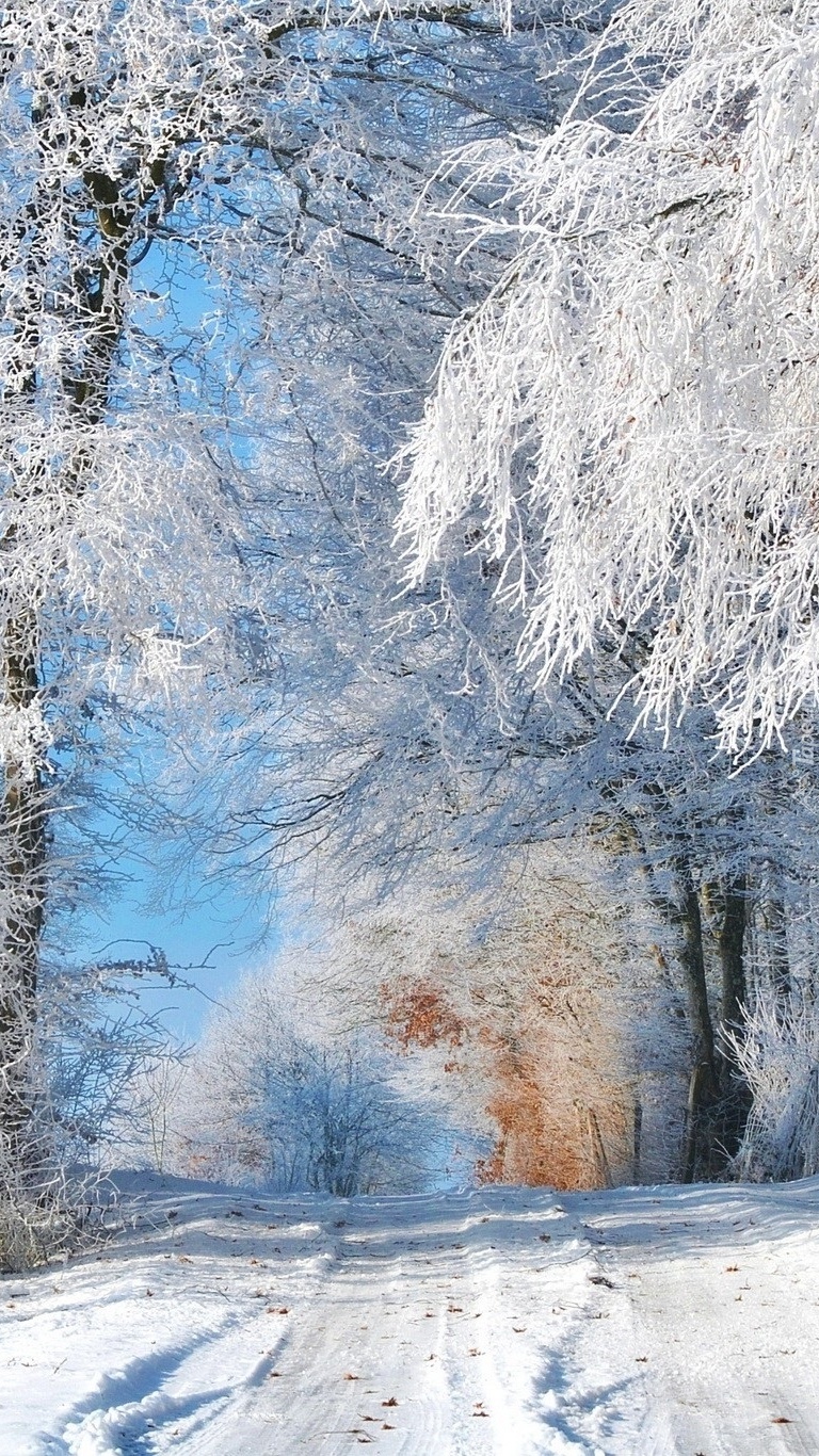 Edytor tapety: Droga pośród oszronionych drzew