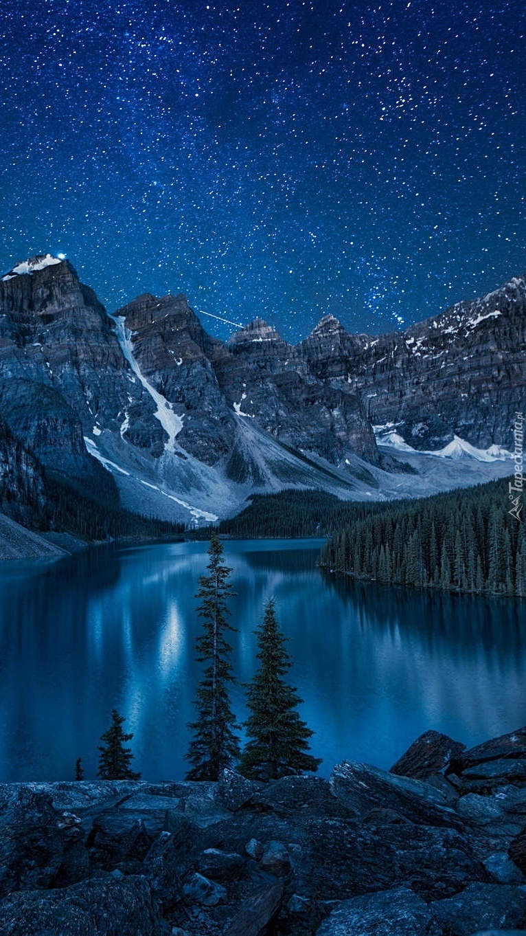 Edytor tapety: Gwiazdy nocą nad jeziorem w górach