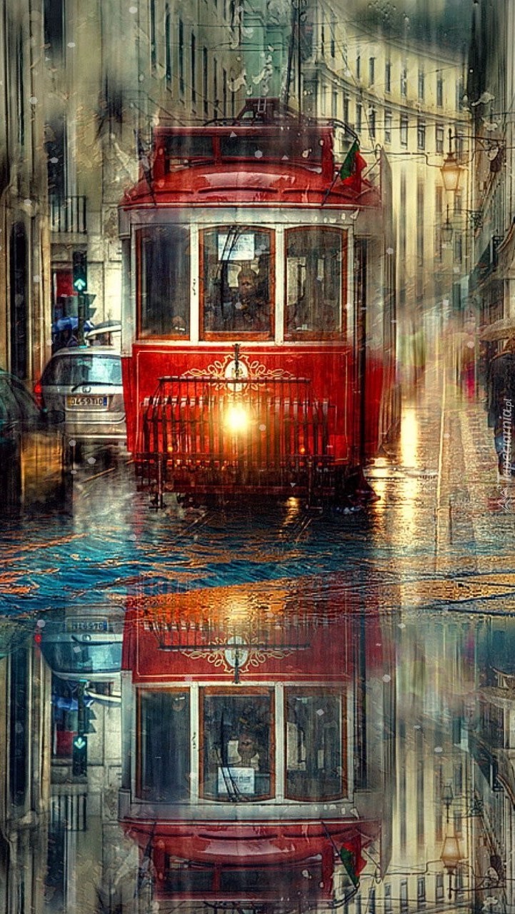 Edytor tapety: Tramwaj w ruchu na wąskiej ulicy