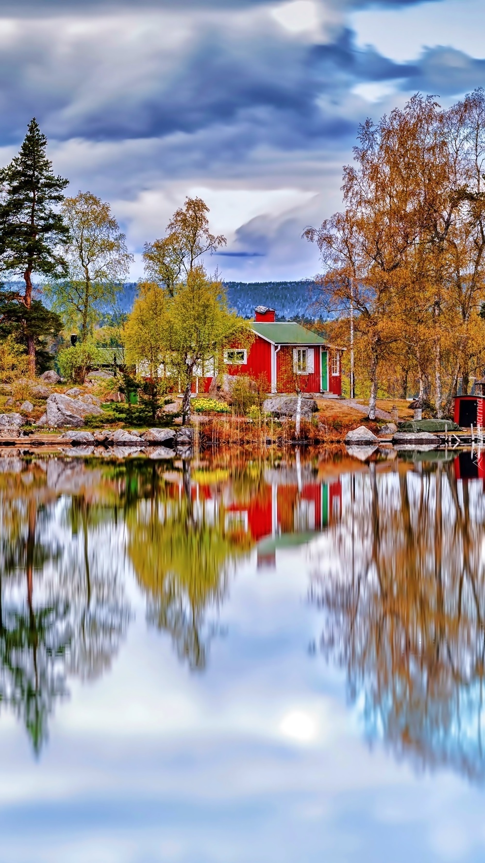 Edytor tapety: Kolorowy domek nad jeziorem