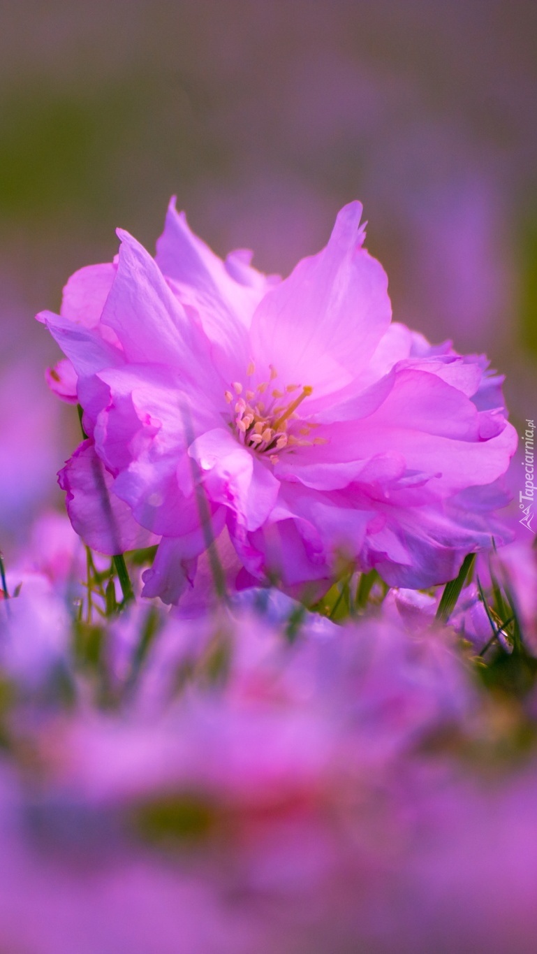 Edytor tapety: Różowe kwiaty w zielonej trawie.