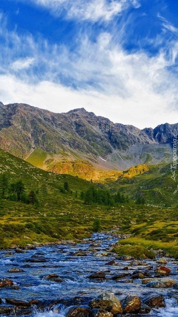 Edytor tapety: Górska roślinność nad kamienistą rzeką