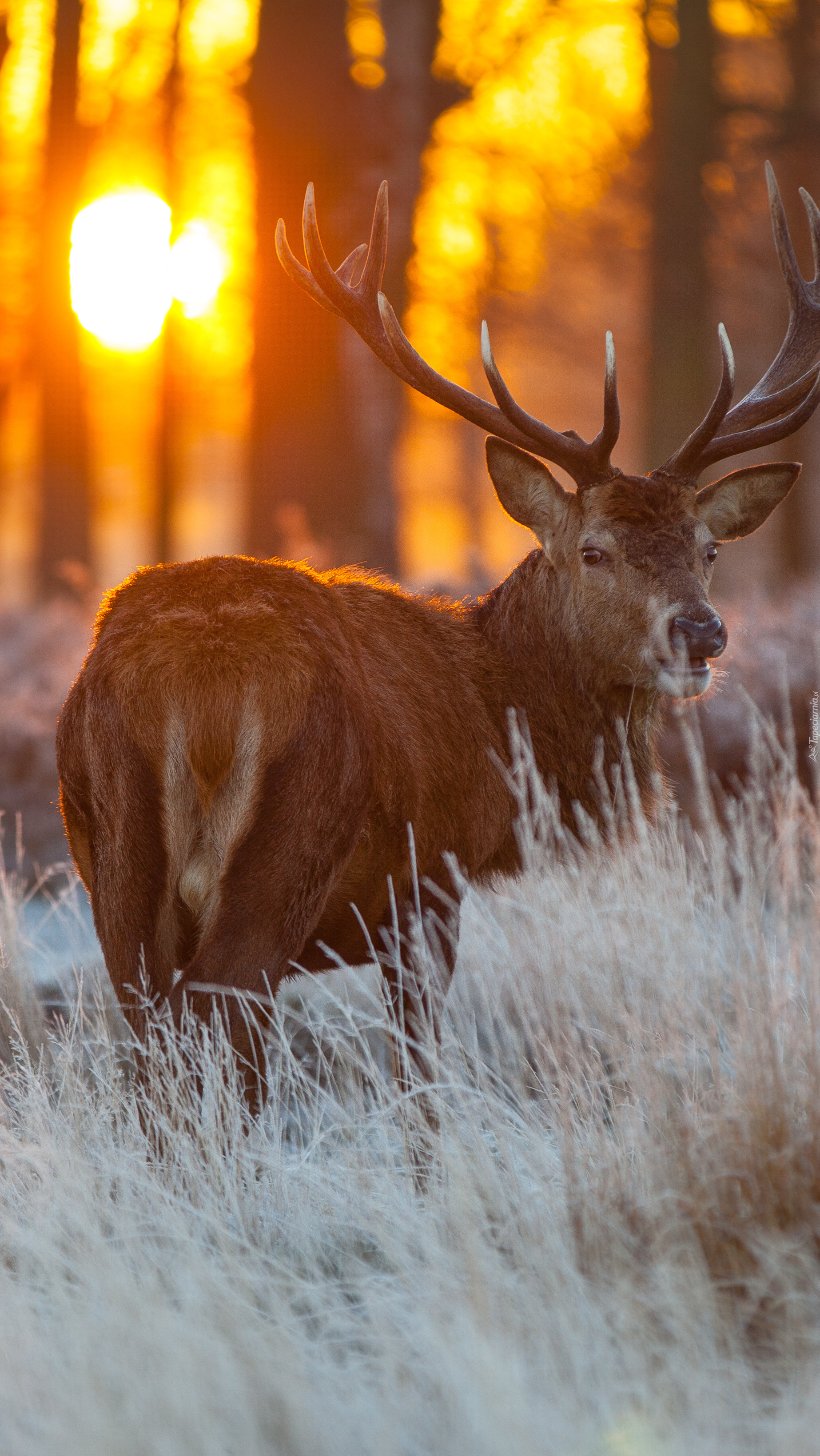 Edytor tapety: Jeleń w lesie o zachodzie słońca