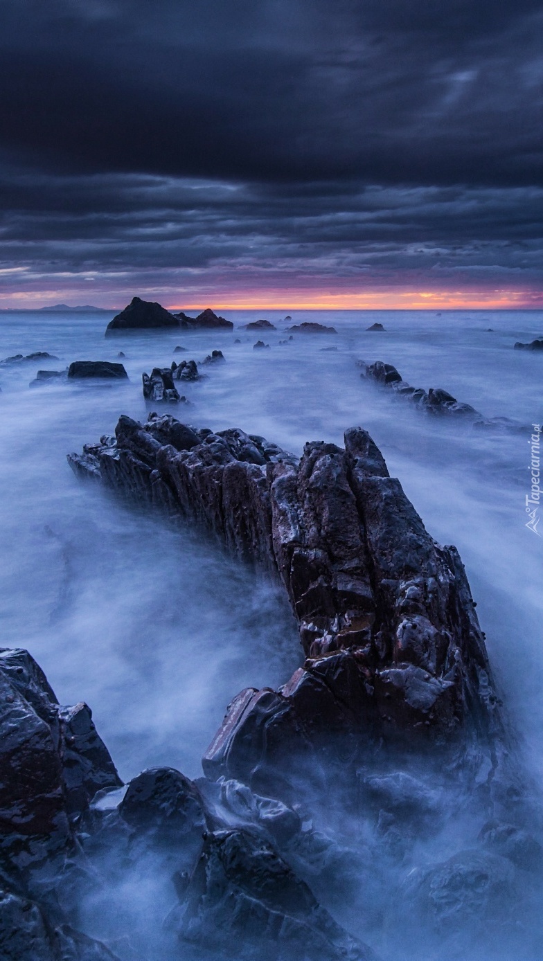 Edytor tapety: Ciemne chmury nad morskimi skałami