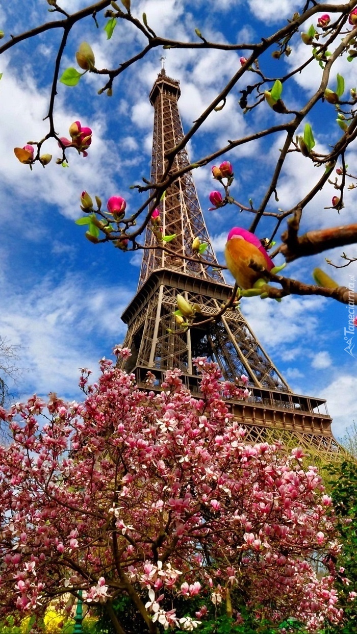 Edytor tapety: Wieża Eiffla pośród kwitnących drzew