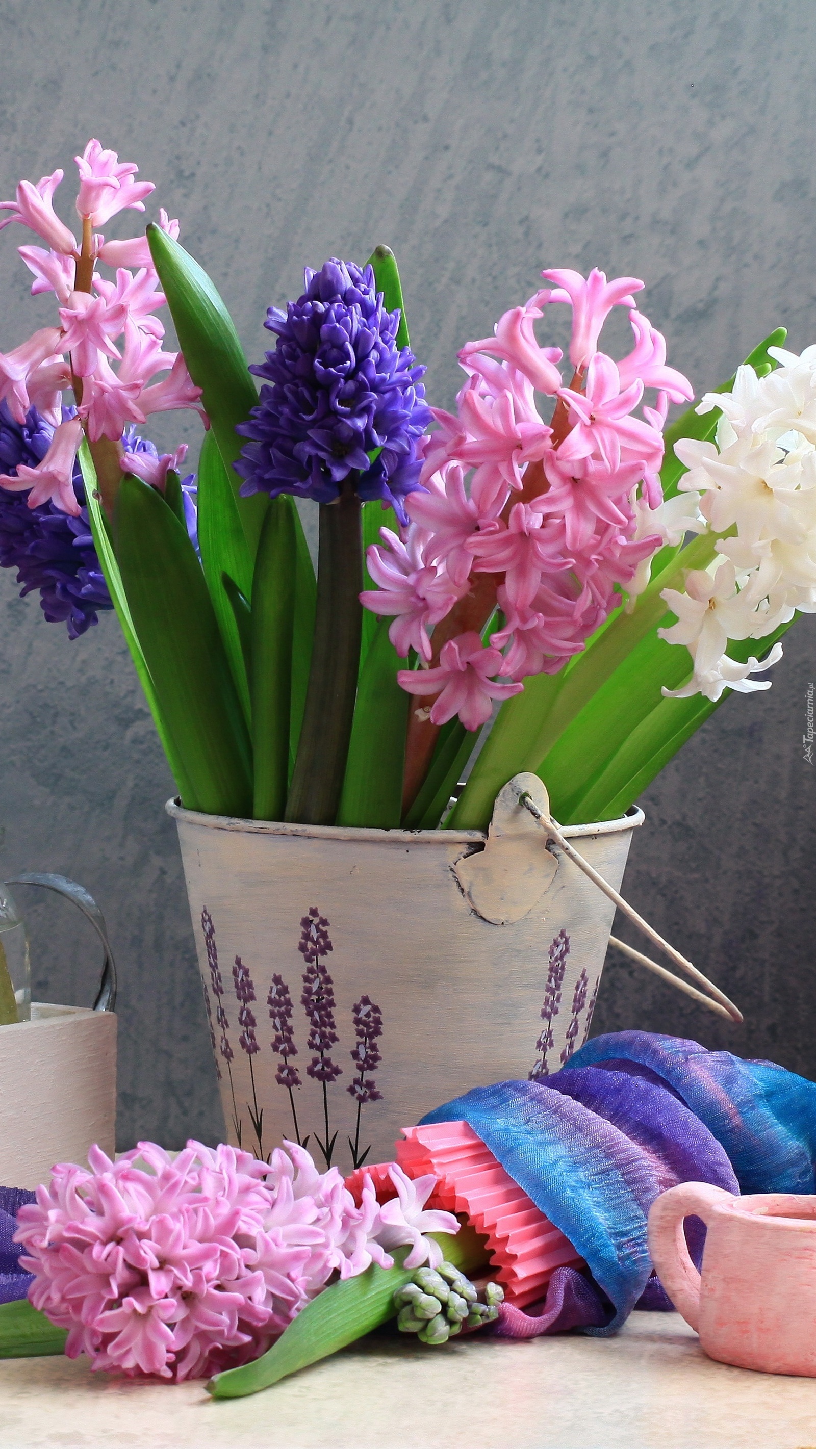 Edytor tapety: Hiacynty kolorowe w wiaderku