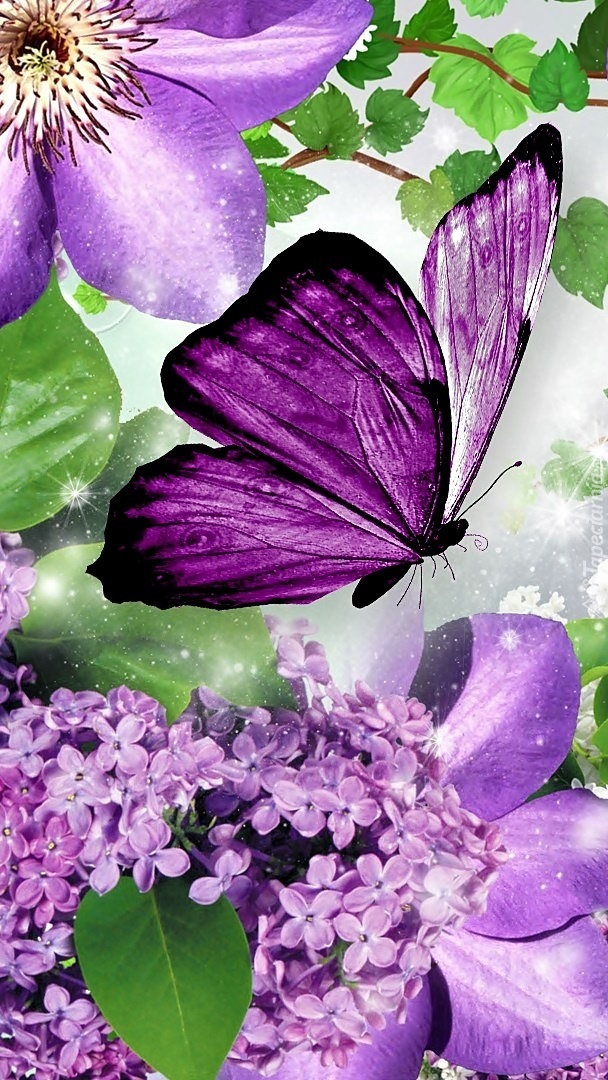 Edytor tapety: Motyl siadający na powojniku pośród bzu