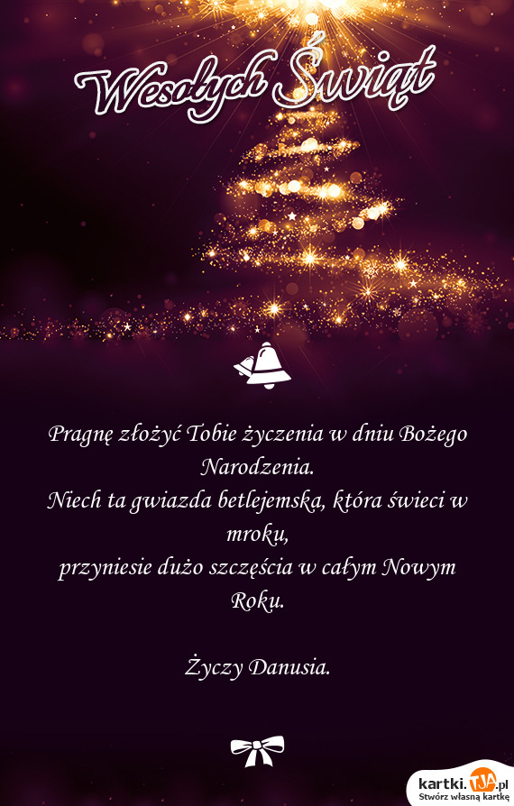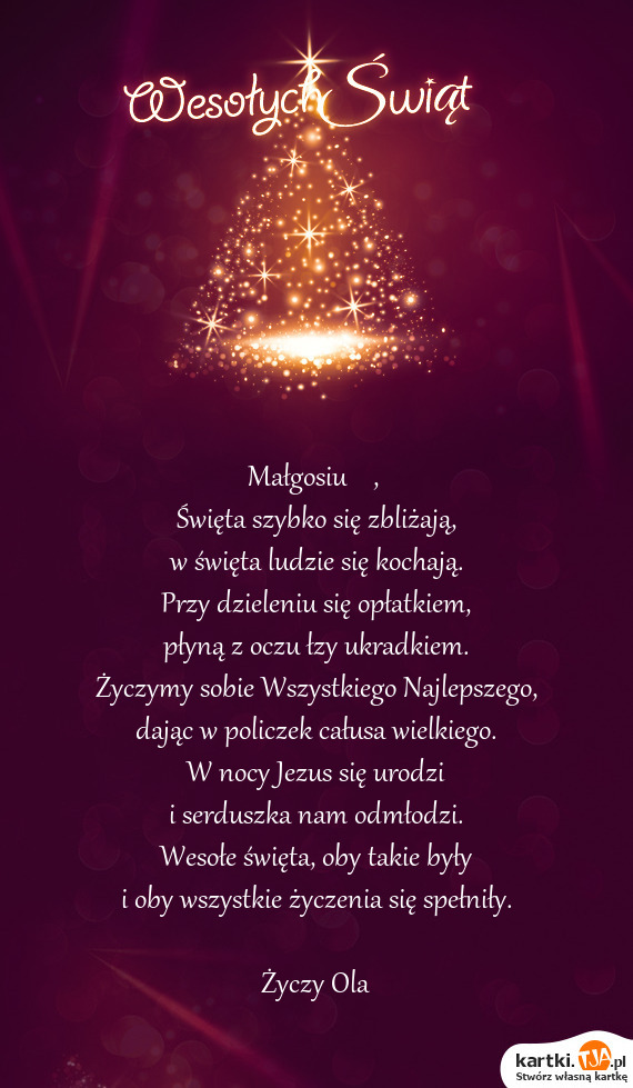 Mnóstwo prezentów pod zieloną choinką, pyszności na wigilijnym stole, wspaniałej rodzinnej atmosfery, wypełnionej melodią staropolskich kolęd, a także wystrzałowego, bąbelkowego Sylwestra i spełnienia marzeń w Nowym Roku życzy...Amelia.