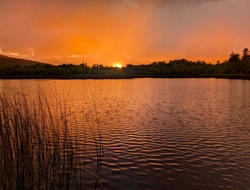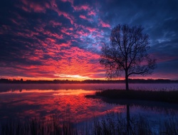Tapeta z największą ilością wyświetleń: Bezlistne drzewa nad zamglonym jeziorem o zachodzie słońca, dodana przez basikp Gratulujemy!