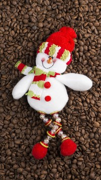 Bałwanek w czapce i szaliku na ziarnach kawy