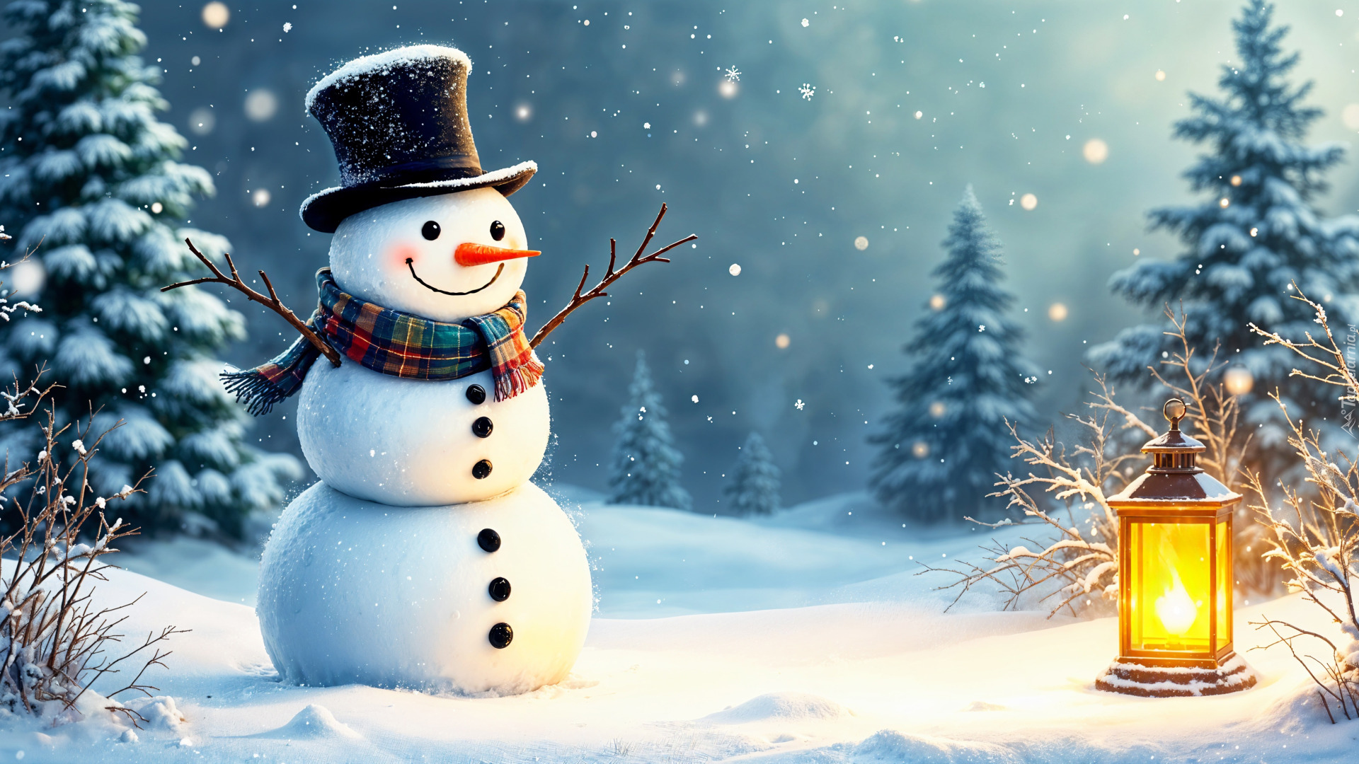 Tagi: Zima, Bałwan, Kapelusz, Szalik, Śnieg, Drzewa, Lampion