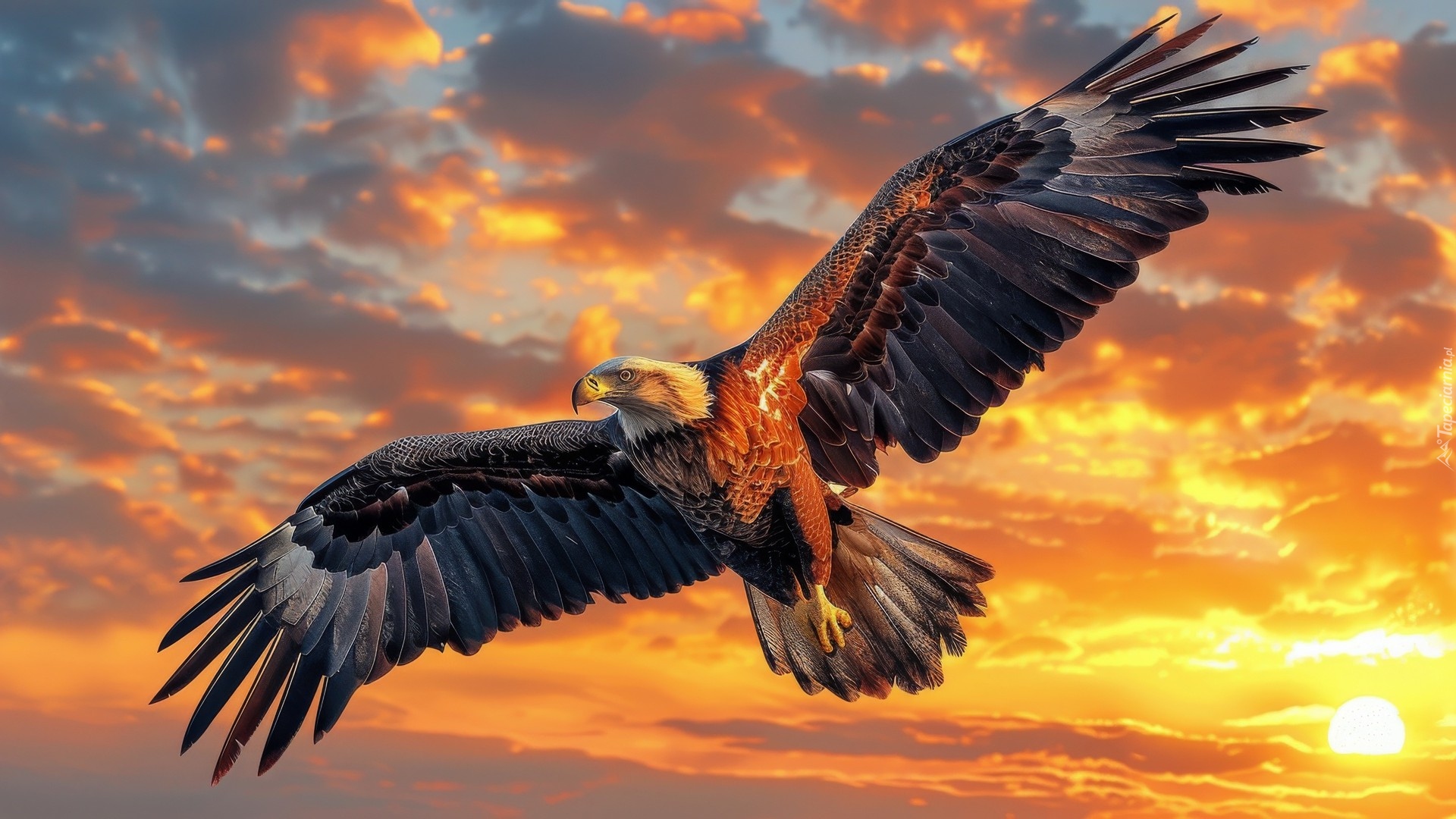 Tagi: Niebo, Słońce, Ptak, Bielik amerykański, Rozpostarte, Skrzydła, Grafika