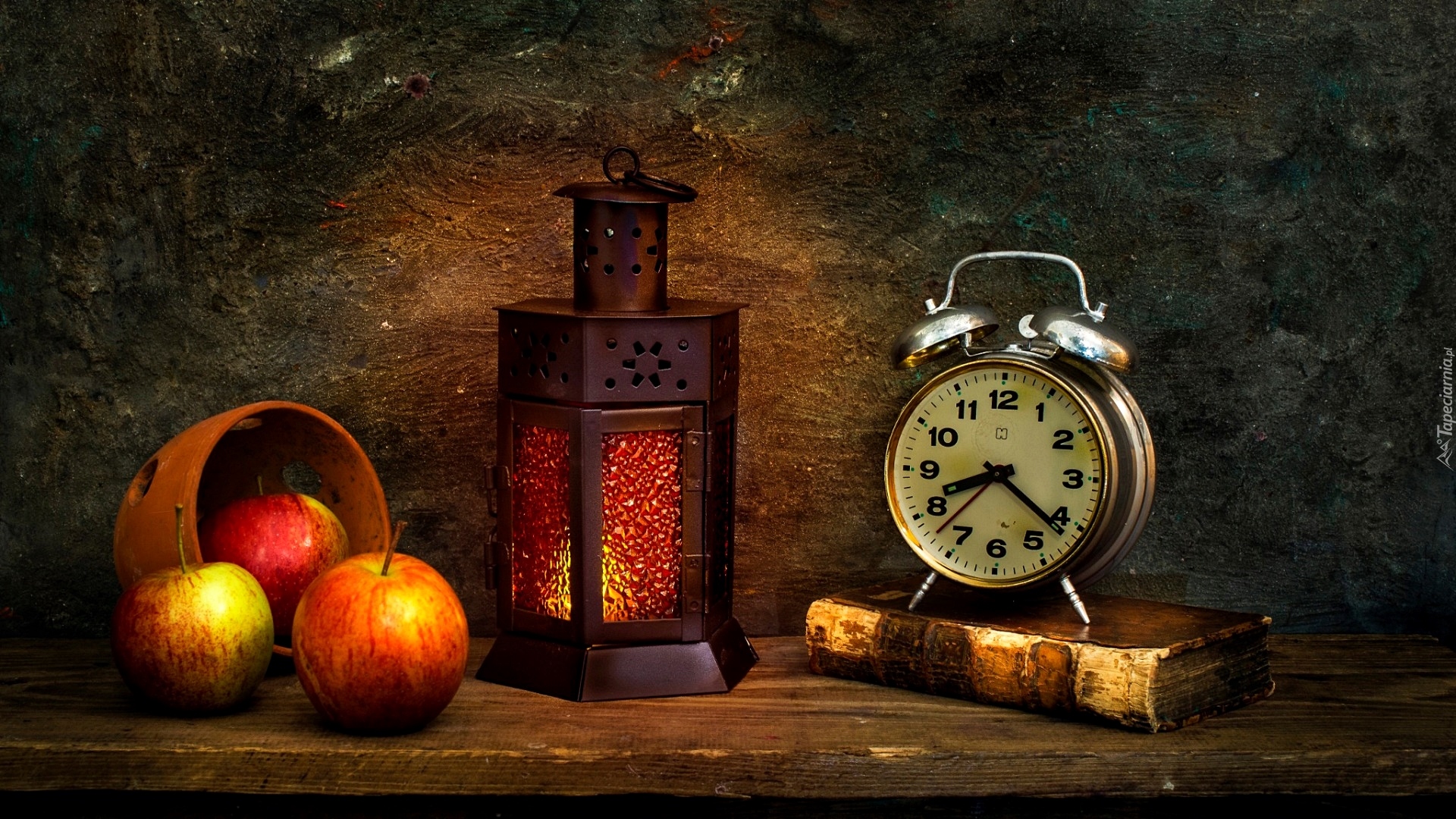 Tagi: Kompozycja, Budzik, Książka, Lampion, Jabłka