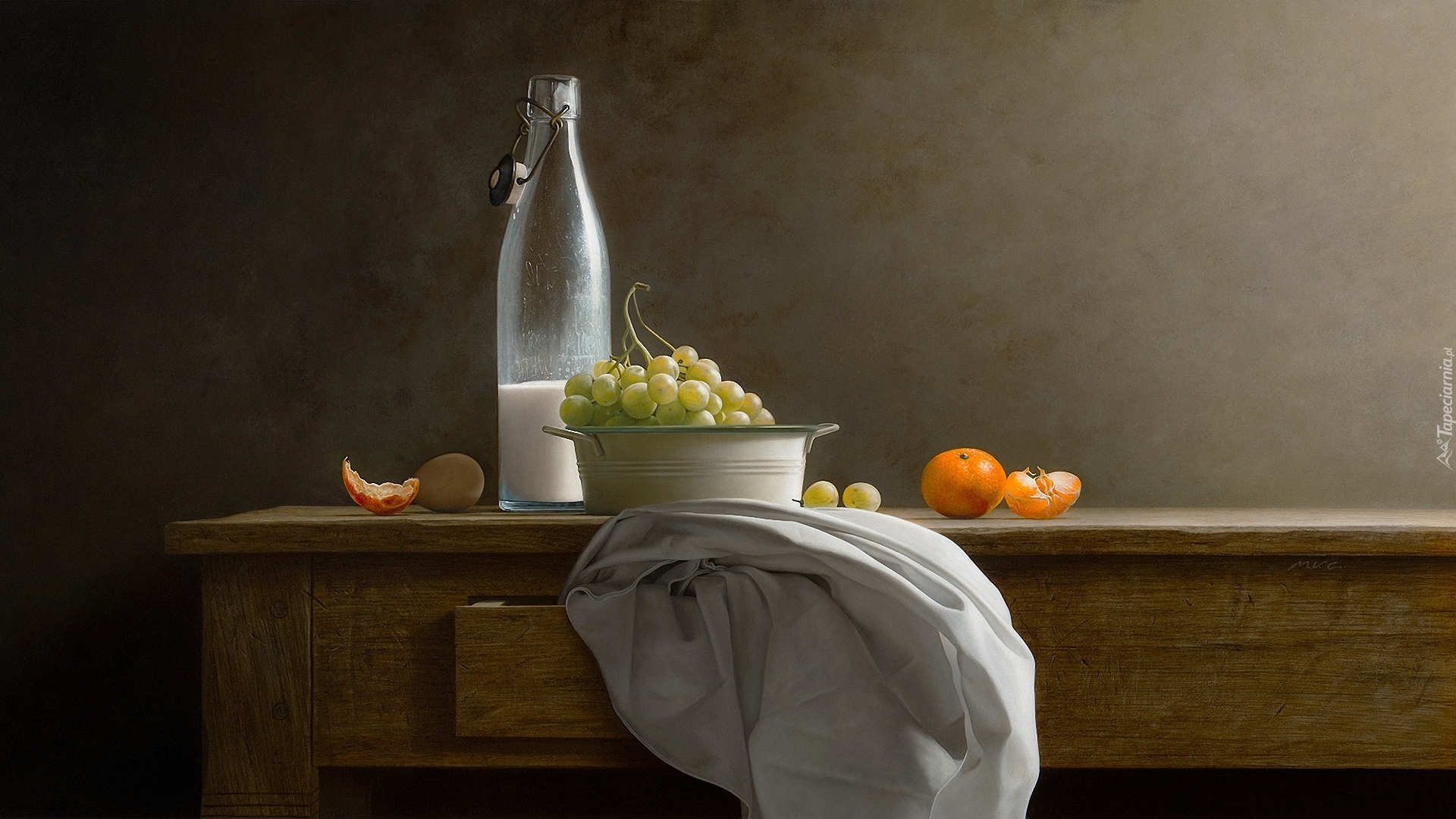 Tagi: Kompozycja, Butelka, Mleko, Winogrona, Mandarynka, Stół