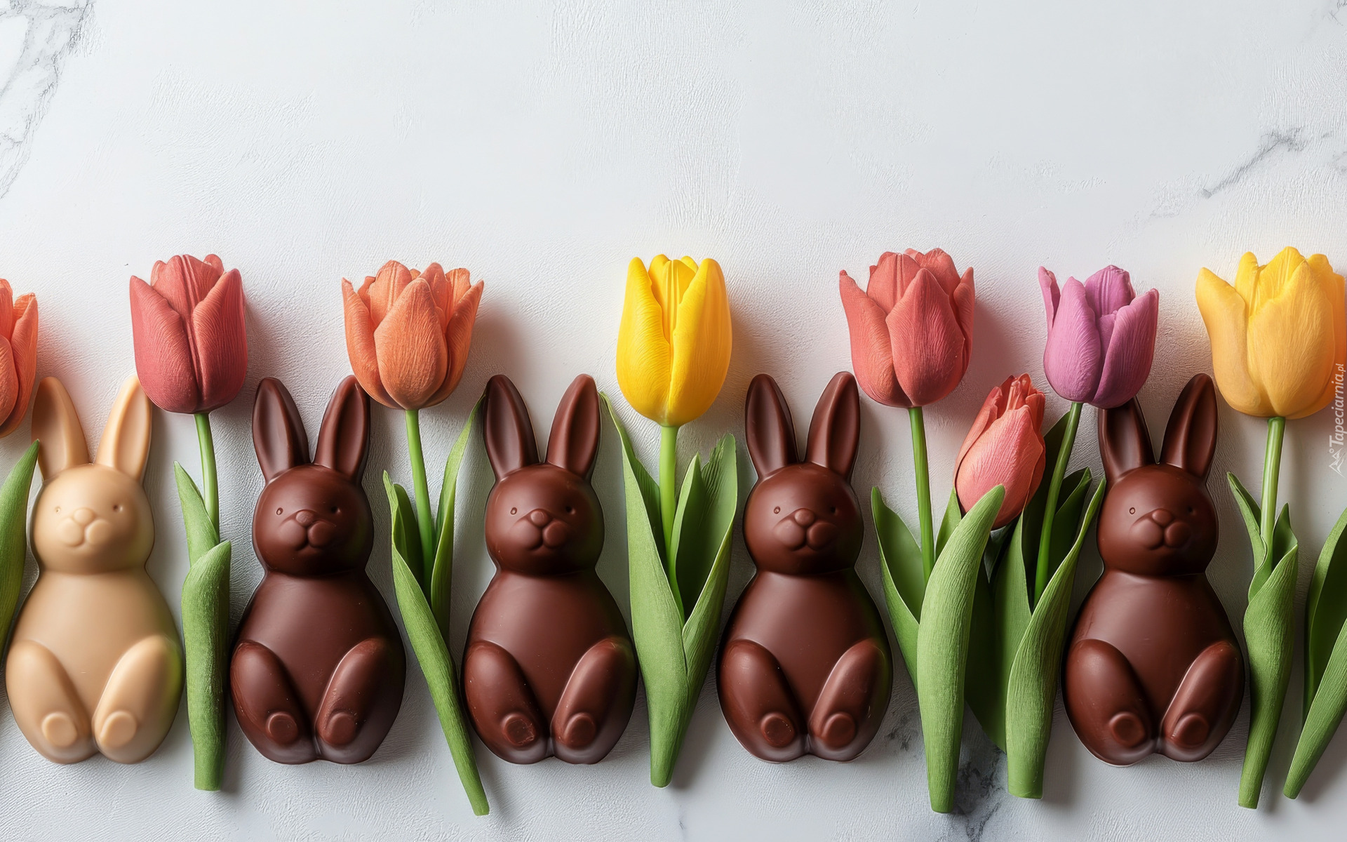 Tagi: Kwiaty, Kolorowe, Tulipany, Czekoladowe, Króliki, Białe, Tło, Kompozycja
