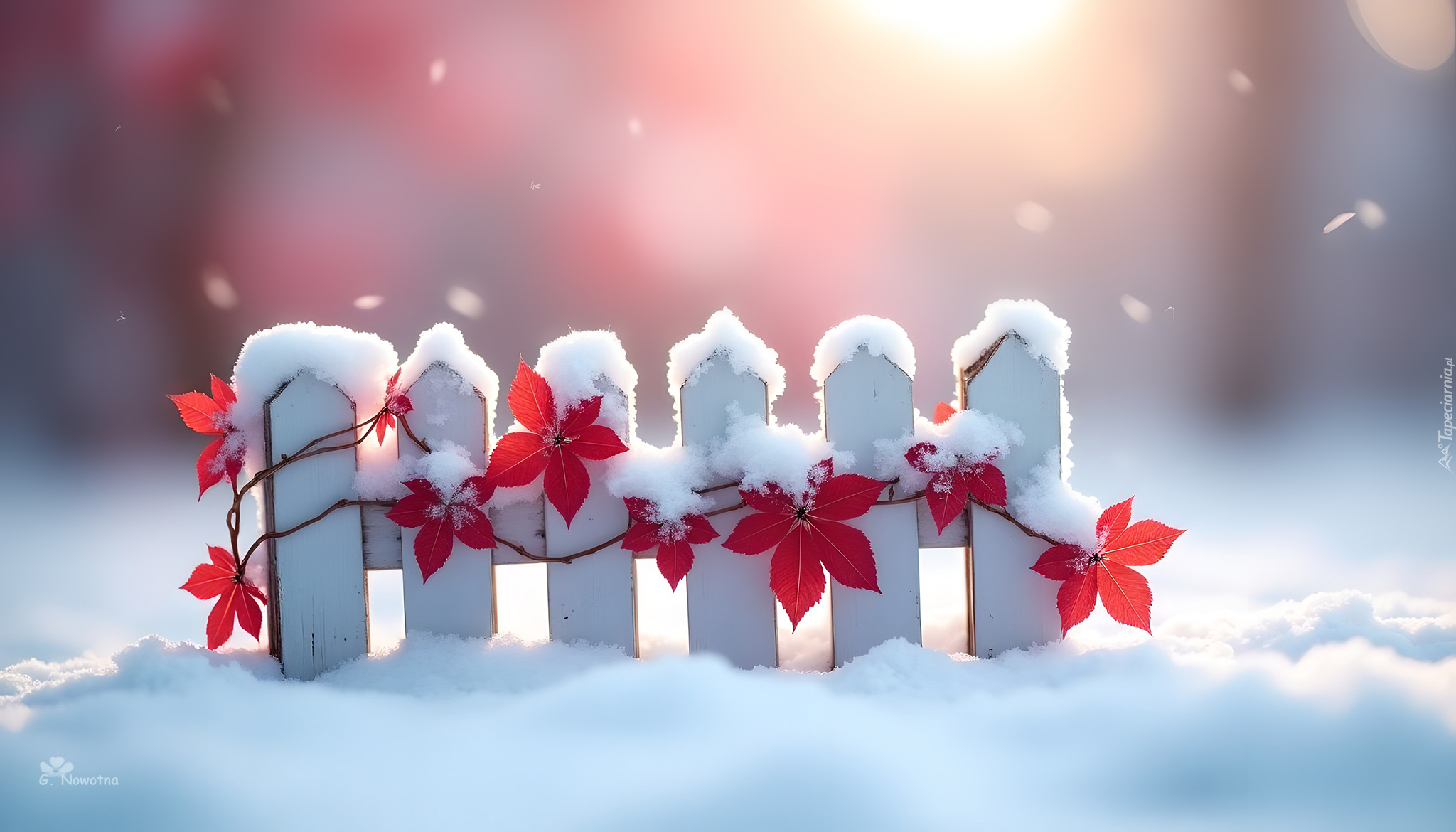 Tagi: Biały, Płotek, Czerwona, Winorośl, Liście, Śnieg, Zima