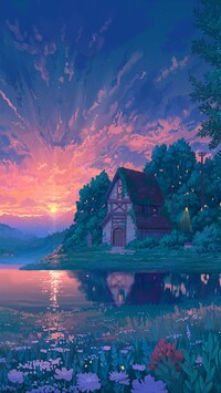 Tagi: Dom, Jezioro, Drzewa, Wschód słońca, Kwiaty, Grafika