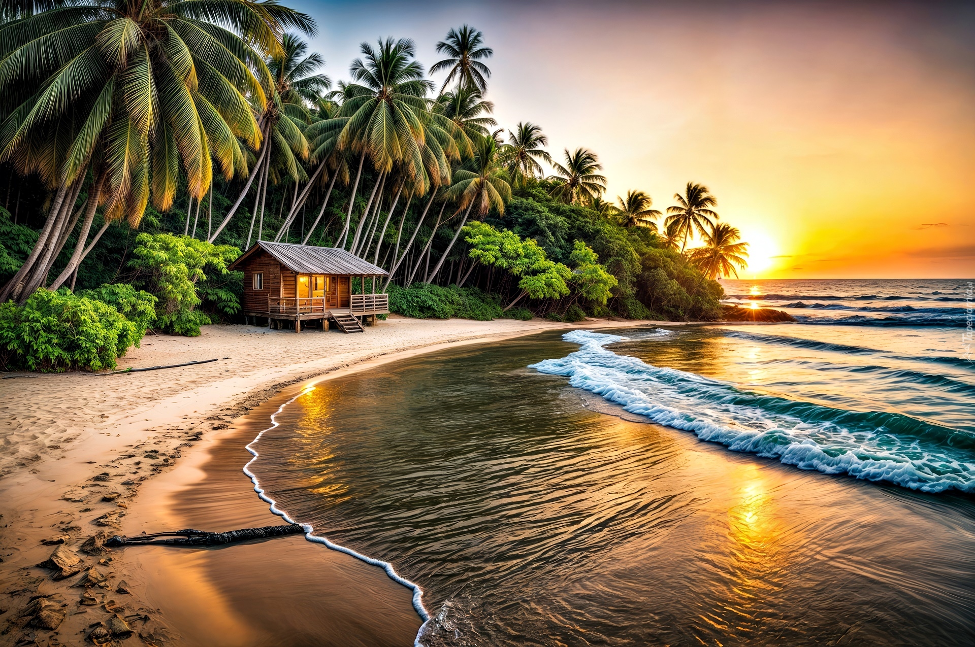 Tagi: Palmy, Domek, Plaża, Morze, Zachód słońca, Grafika