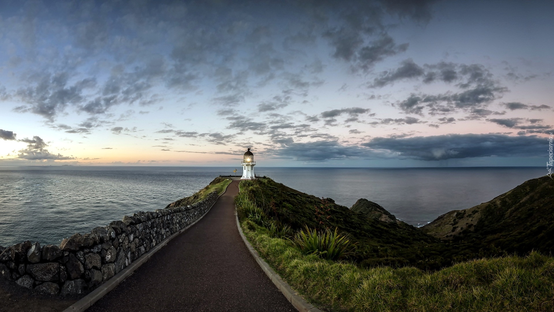 Nowa Zelandia, Wyspa Północna, Latarnia morska Cape Reinga Lighthouse, Droga, Morze, Niebo