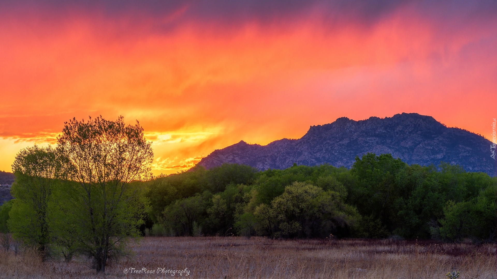 Tagi: Zachód słońca, Góry, Drzewa, Trawa