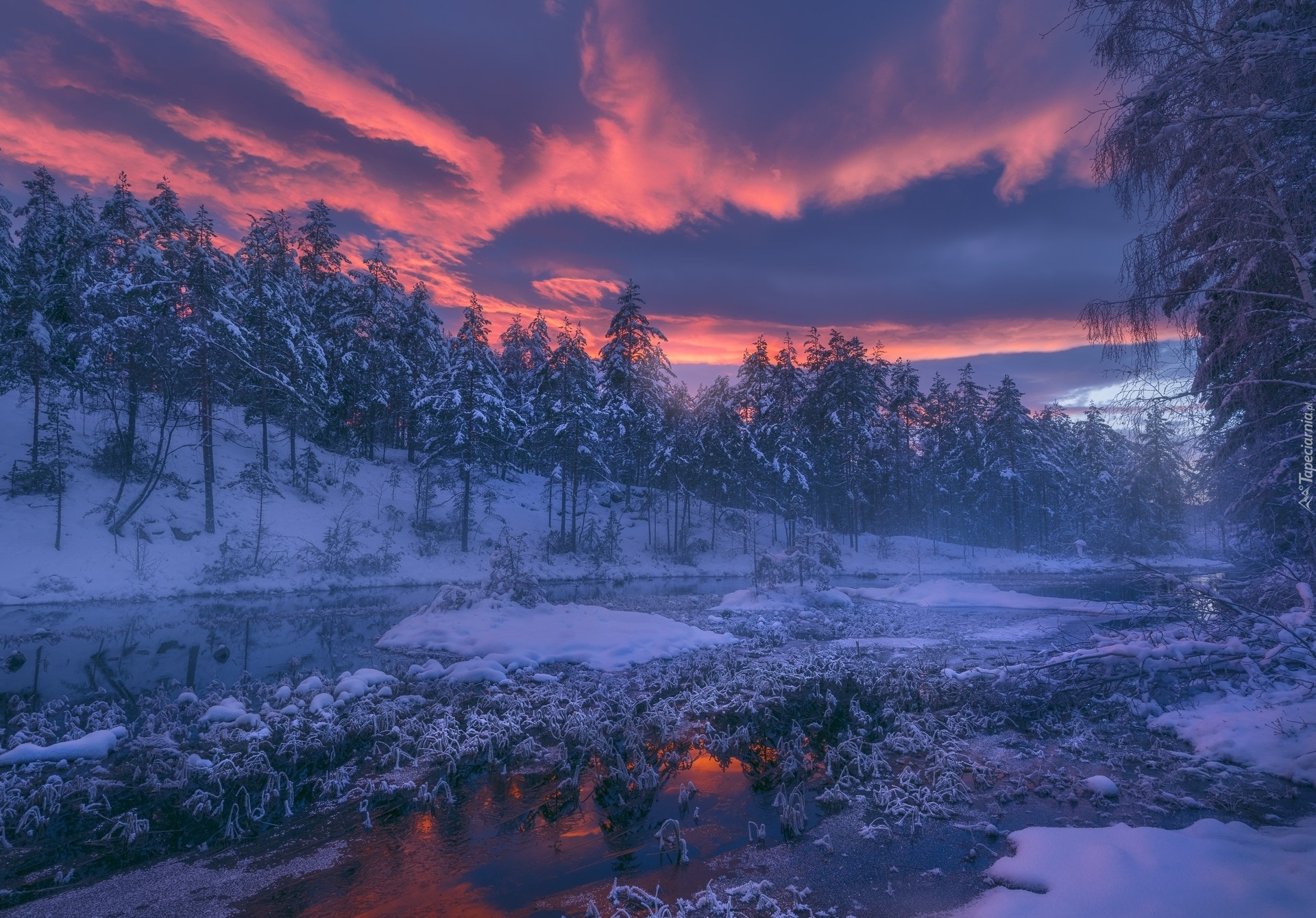 Tagi: Zima, Drzewa, Las, Jezioro, Wschód słońca, Chmury, Gmina Ringerike, Norwegia