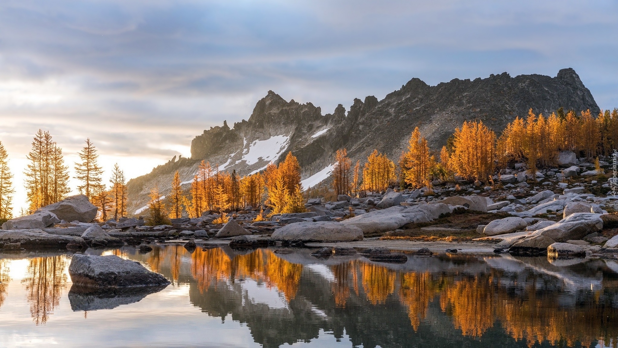 Tagi: Jesień, Góry Kaskadowe, Jezioro Snow Lake, Rezerwat przyrody, Alpine Lakes Wilderness, Drzewa, Kamienie, Odbicie, Stan Waszyngton, Stany Zjednoczone