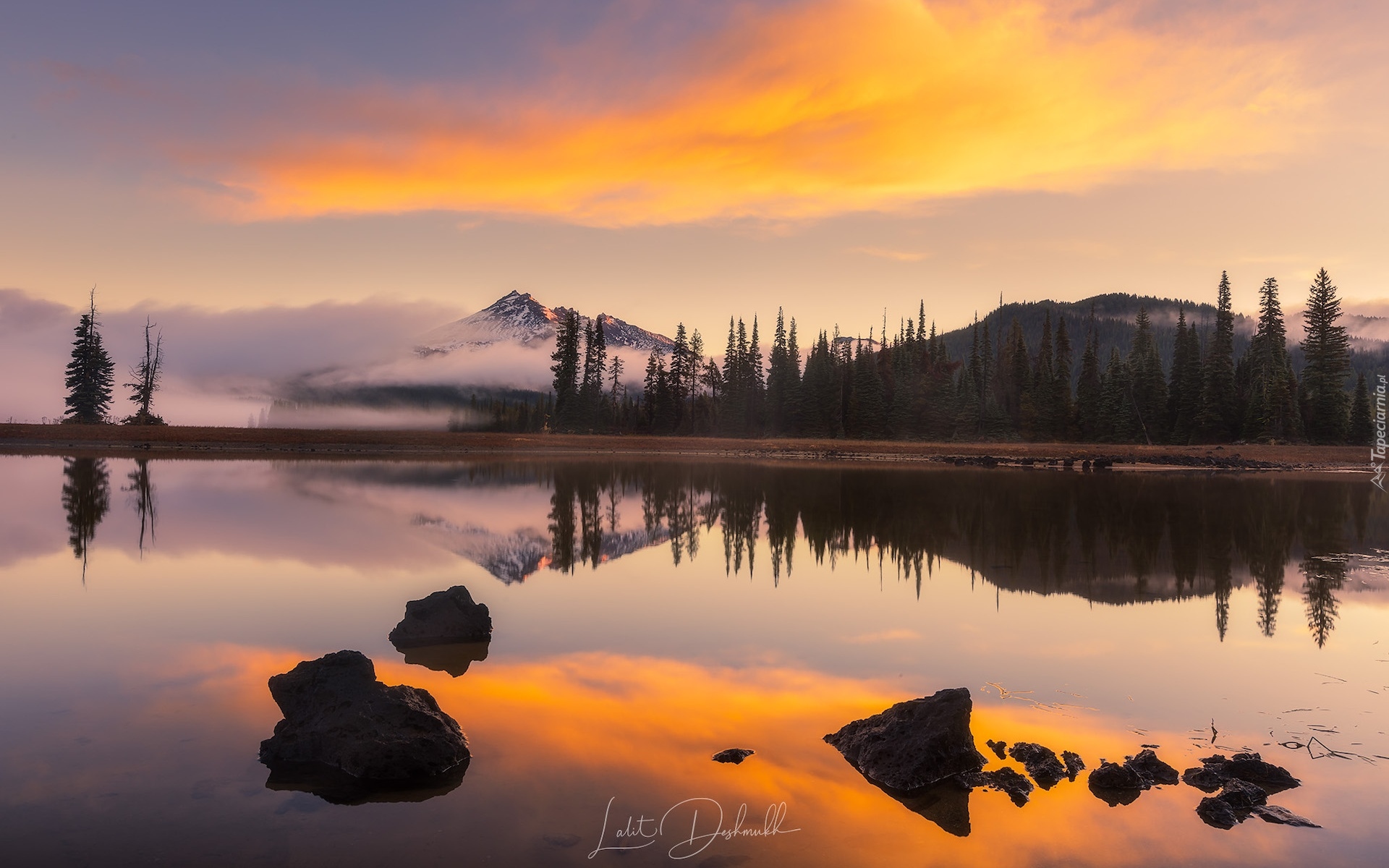 Tagi: Góry, Jezioro, Sparks Lake, Mgła, Drzewa, Kamienie, Oregon, Stany Zjednoczone