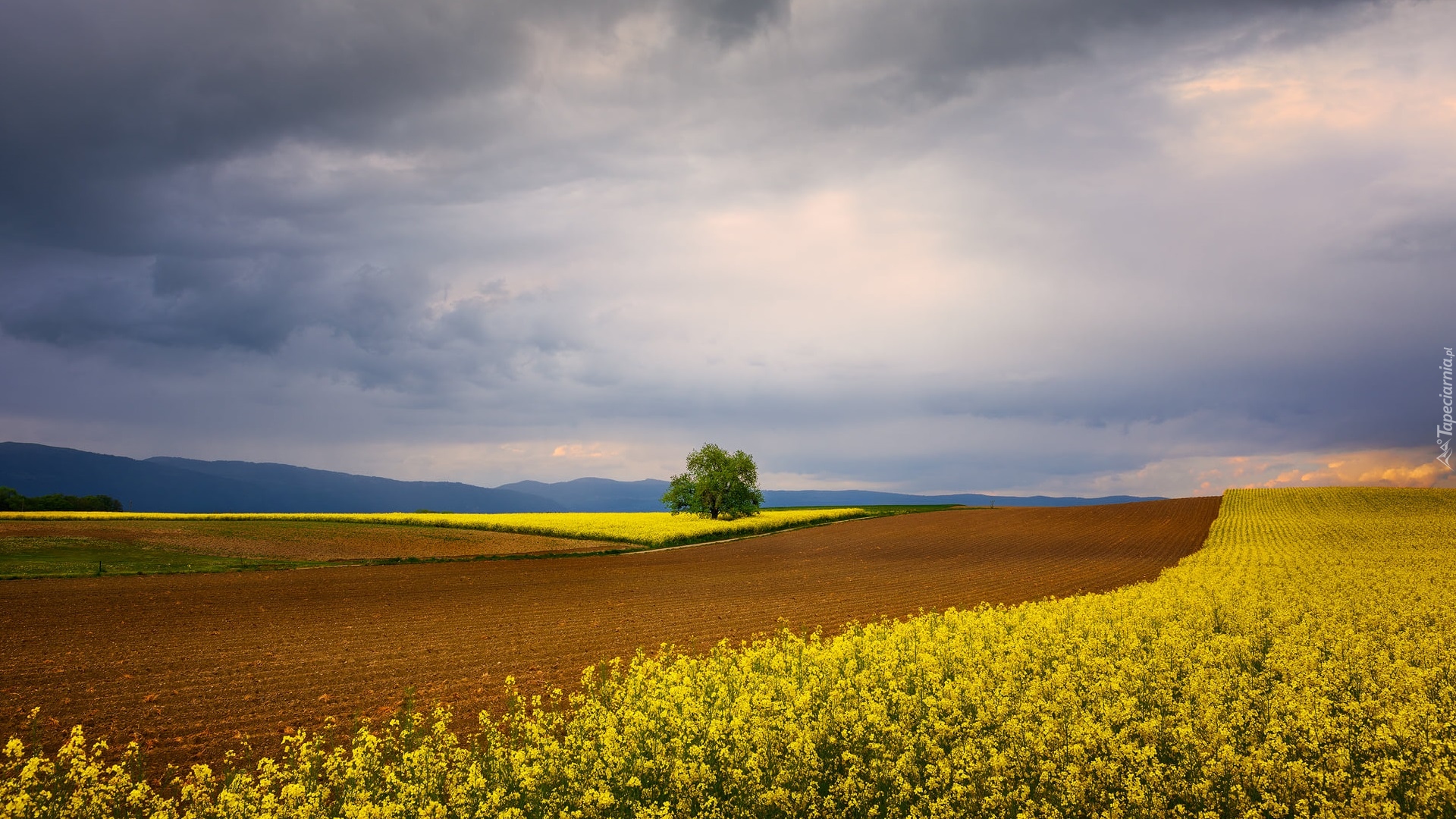 Pole, Rzepak, Drzewo, Chmury, Niebo