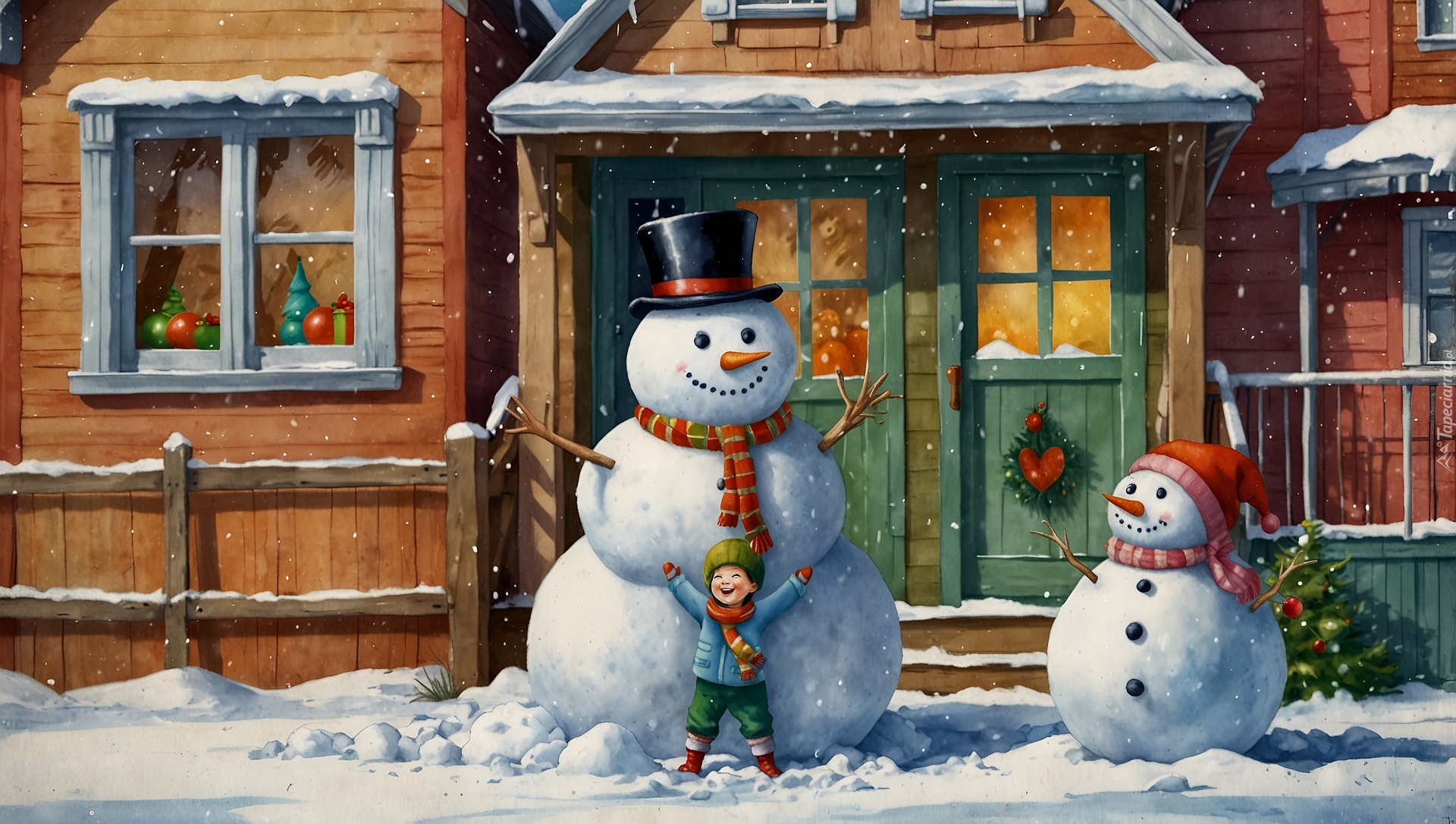 Tagi: Grafika, Zima, Bałwany, Śnieg, Domek, Drewniany
