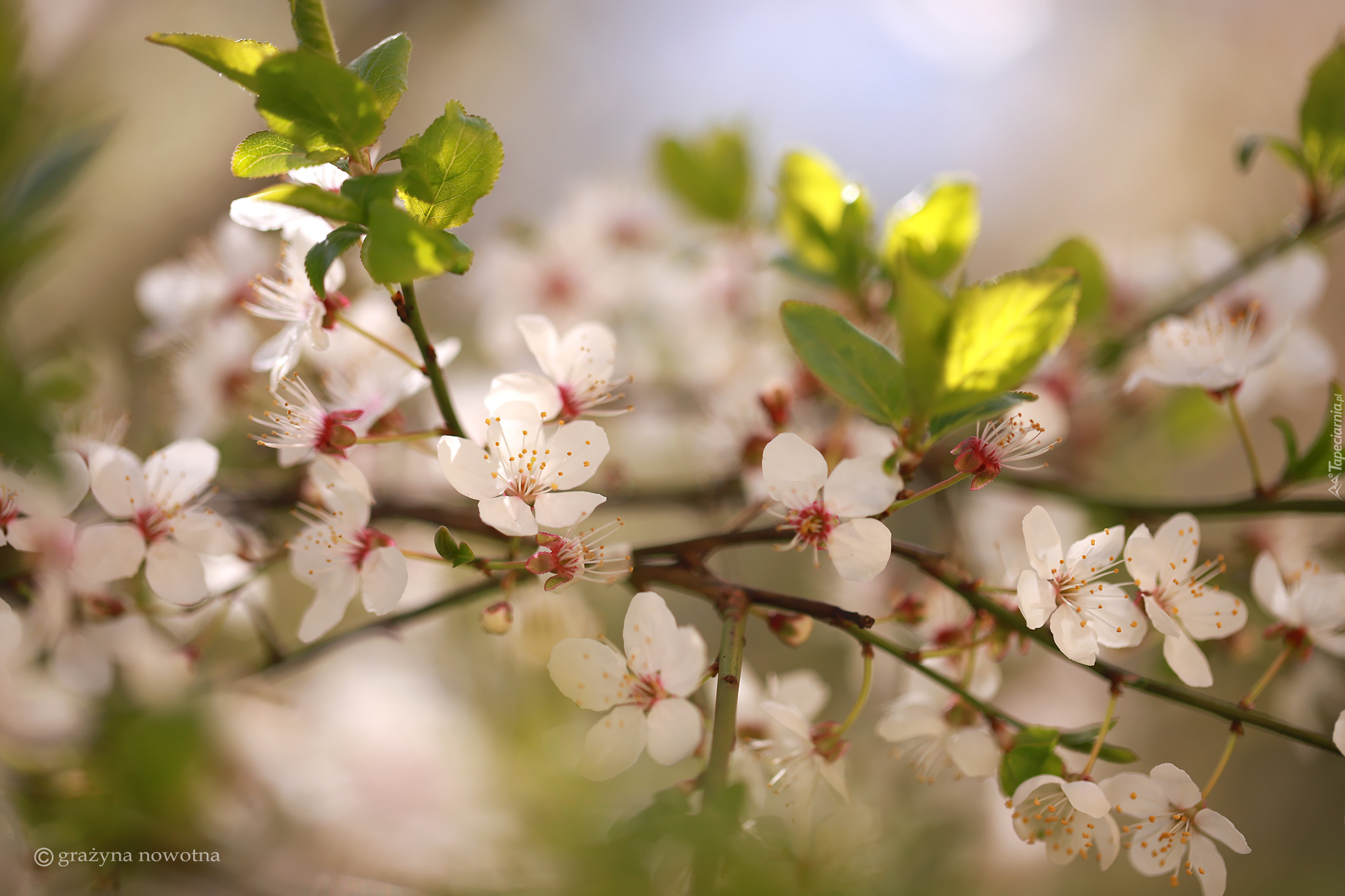 Tagi: Białe, Kwiaty, Drzewo owocowe, Gałązki, Listki