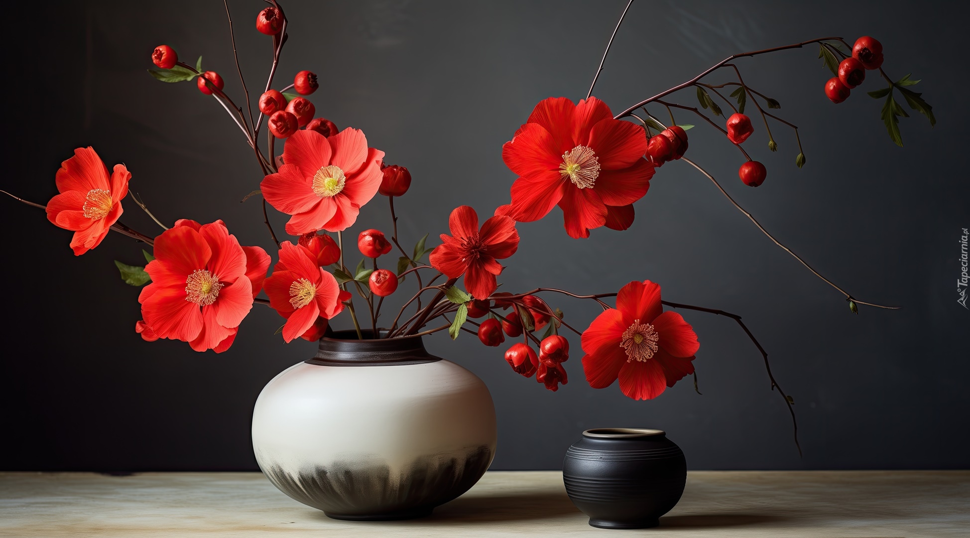 Tagi: Kwiaty, Czerwone, Gałązki, Bukiet, Kompozycja, Grafika